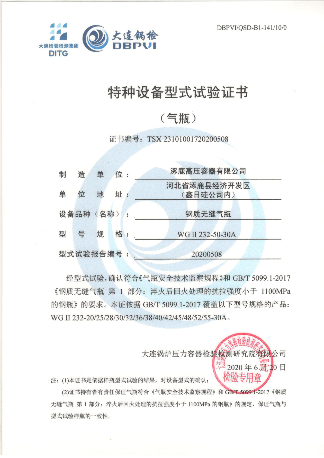 特種設備形式試驗證書(鋼制無縫氣瓶)WGⅡ232-50-20A