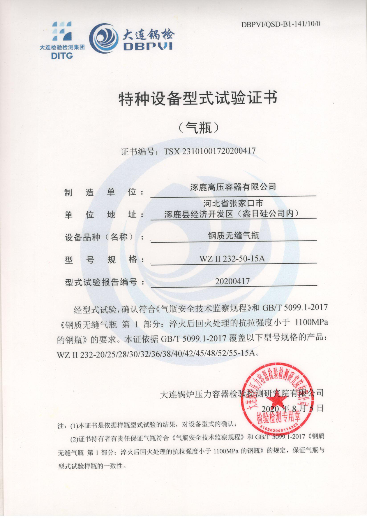 特種設(shè)備形式試驗(yàn)證書(鋼制無縫氣瓶)WGⅡ232-50-15A