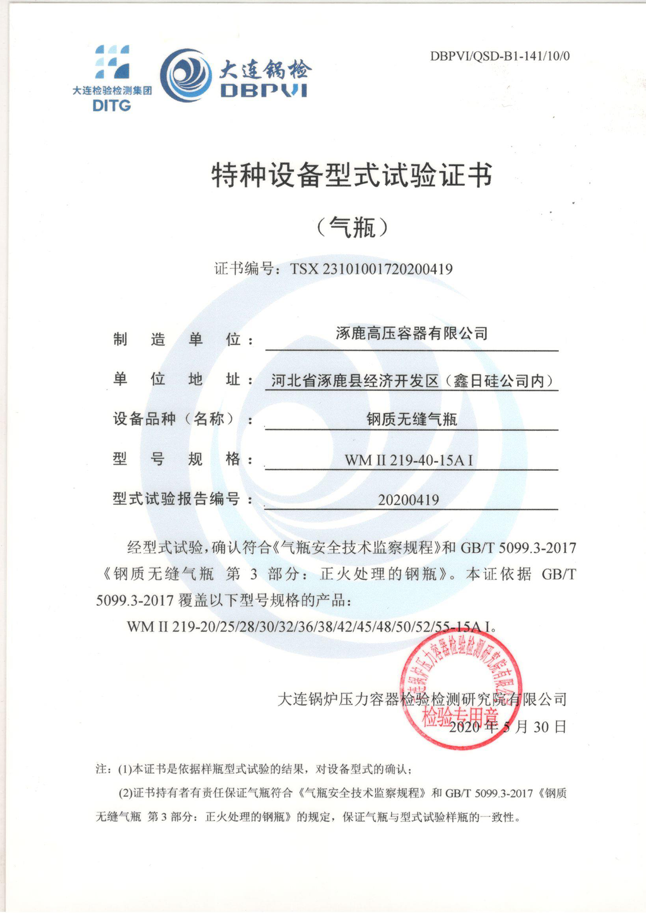 特種設(shè)備形式試驗證書(鋼制無縫氣瓶)WMⅡ219-40-15AI